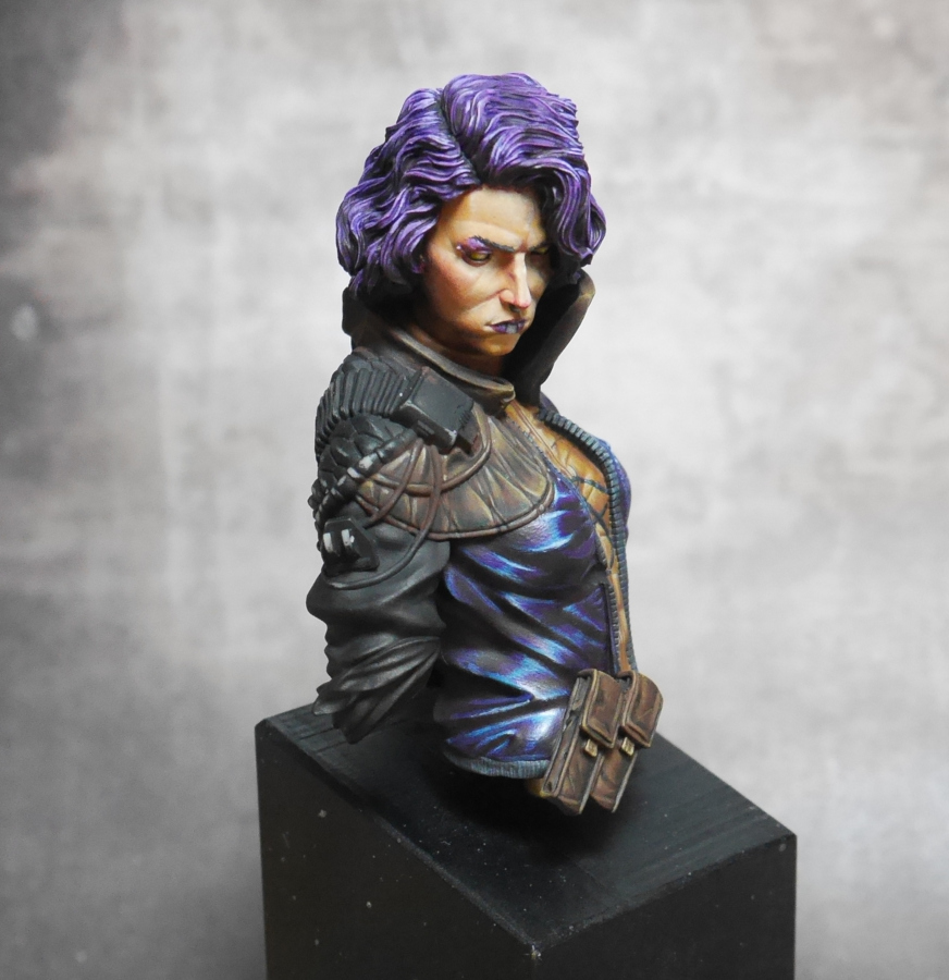Next on my plate was, of course, the slightly delayed but lovely Fox Jupiter, standing in for Aeon Flux. She’s proving quite paintable – much more so than Trevor, surprisingly – and I’ve made some pretty good progress: