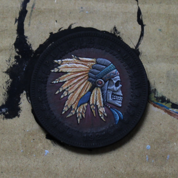 Not to be stopped there, I’ve also started a side project painting up casts of hobo nickels all with the theme of ‘death’ or something. I bought five of them, but we’ll see how many I do before I get sick of them. The first one is basically complete and just needs a little tidying and varnish to finish. The second is one of the hardest pieces to photograph properly that I’ve ever come across. Hopefully it’ll get easier once more of the black gets covered.