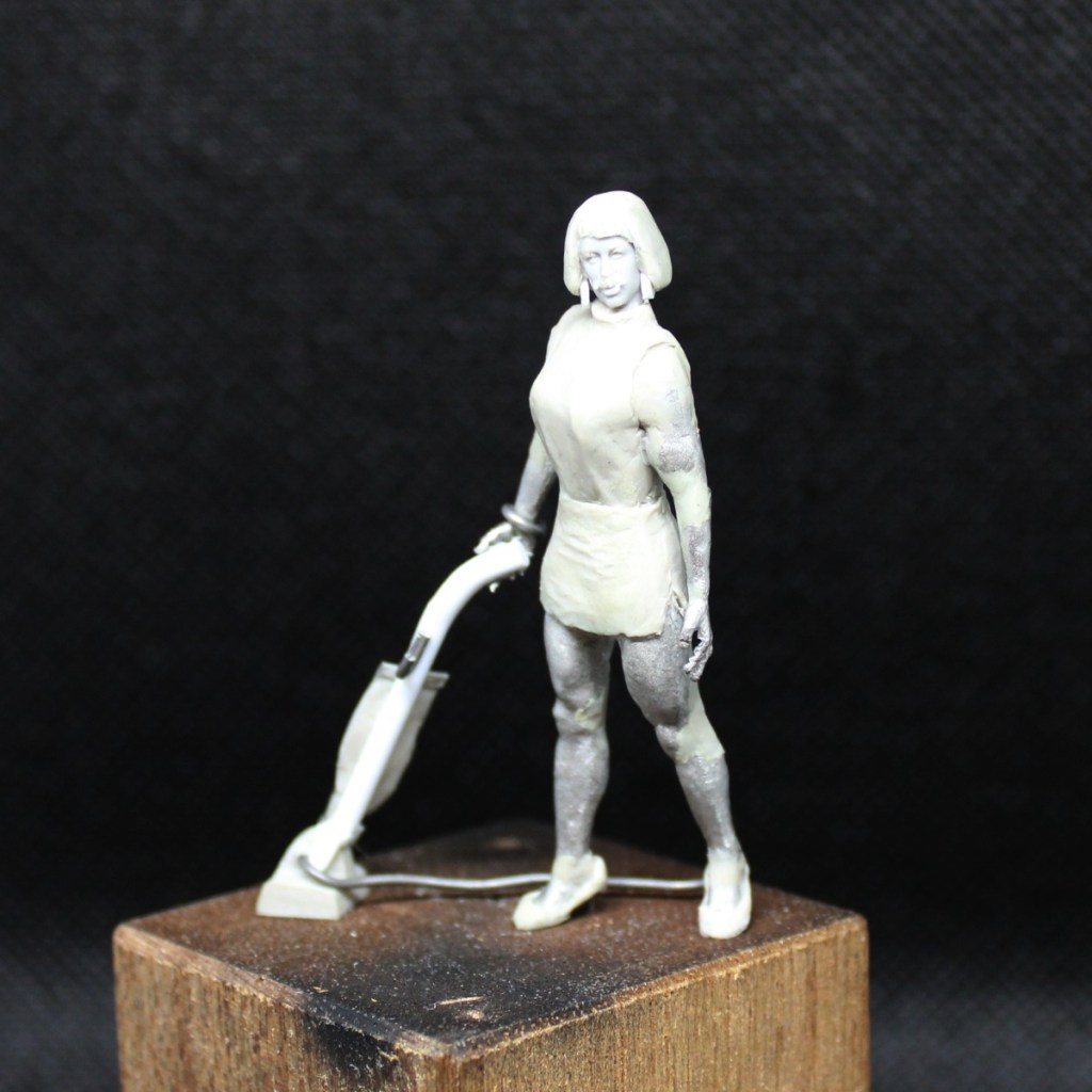 The first of these is Freddie Mercury with a 1950s-era vintage hoover, a la “I want to break free”. For the base model, I used a mannequin from Friulmodel. I took a bit of a gamble on this one, as the website doesn’t show what the actual model looks like, but I figured for the price, it would be hard to go completely wrong. What actually arrived is actually quite a nice wee kit. The ‘visible’ anatomy (legs and arms) are well sculpted, and wouldn’t need too much extra work for more dynamic poses. For Freddie, who’s basically just standing mid-sweep with the hoover, it was simple matter of just bending the limbs into place, twisting the torso ever so slightly, then filling the gaps and adding the clothes: