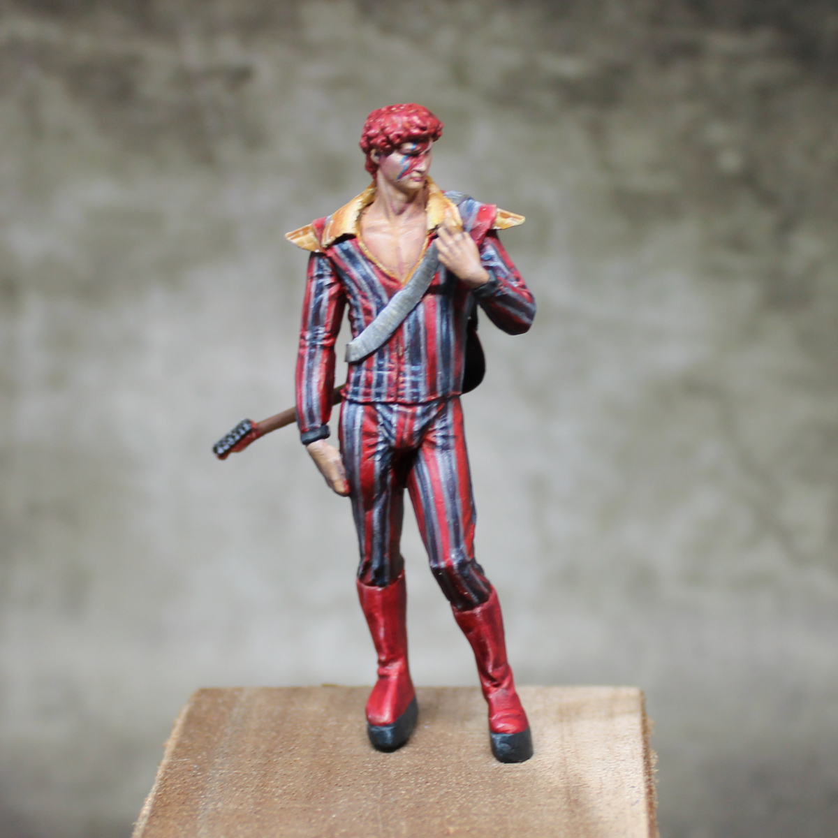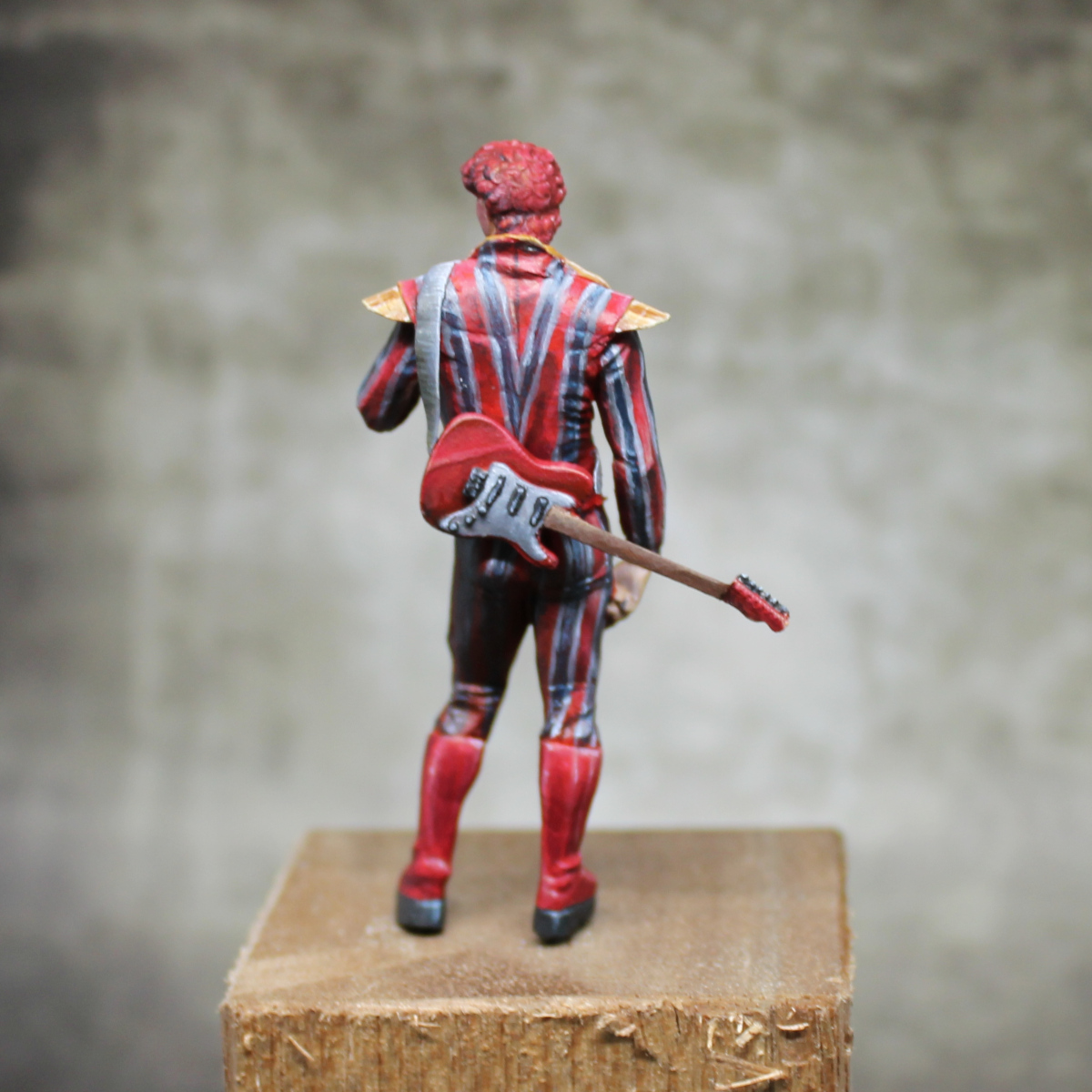 The paint is a bit rough in places, and the light is frankly all over the place, but he’s on stage and the impact is good, so I’m happy to call him done. One of the best parts of this model was discovering that my sculpting was actually pretty good. I enjoyed getting to grips with the various folds, and there weren’t too many parts of the model that annoyed me. The guitar strap is a bit rubbish, and his collar should have been neater and more even, but otherwise job’s a good ‘un.