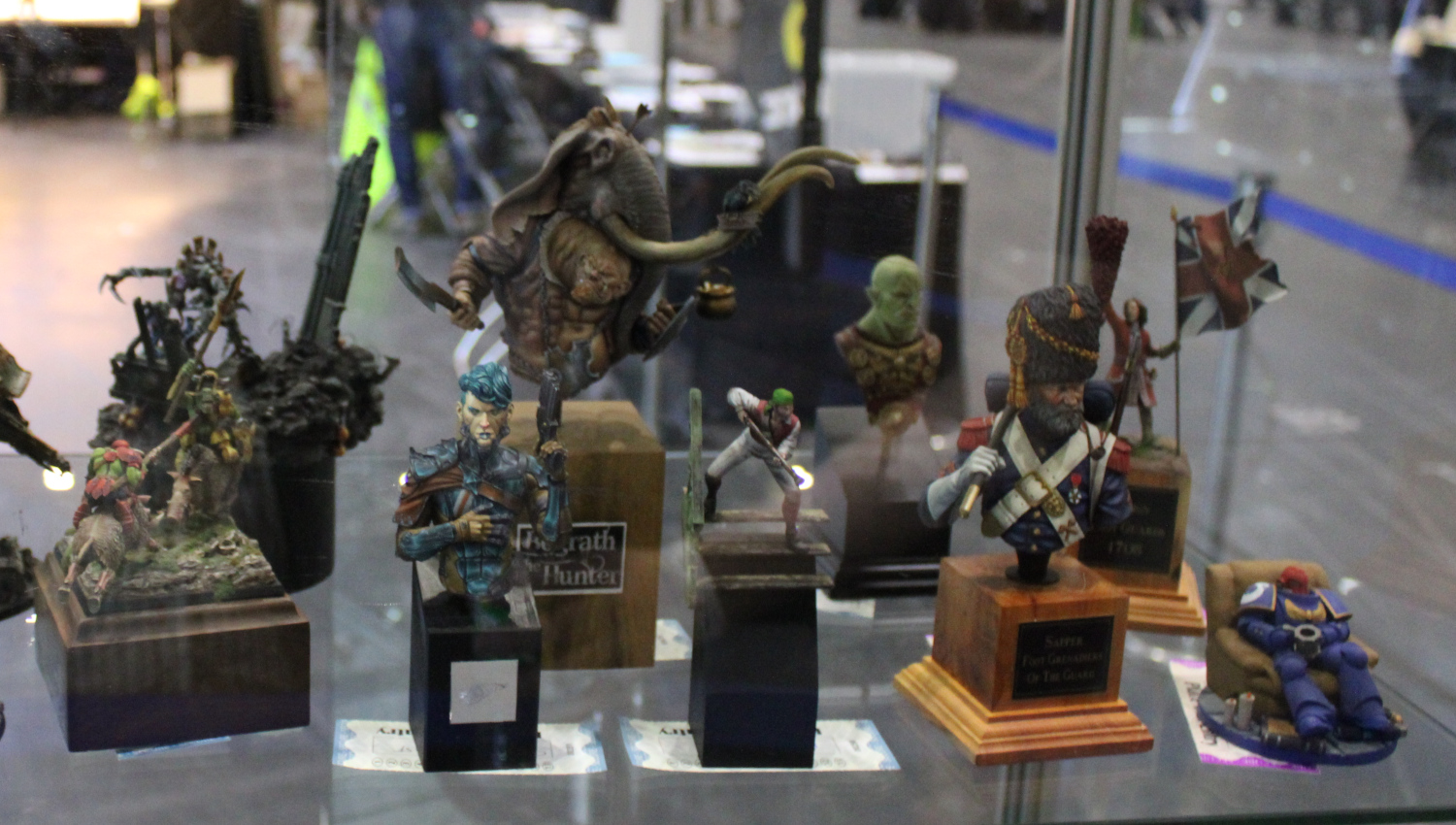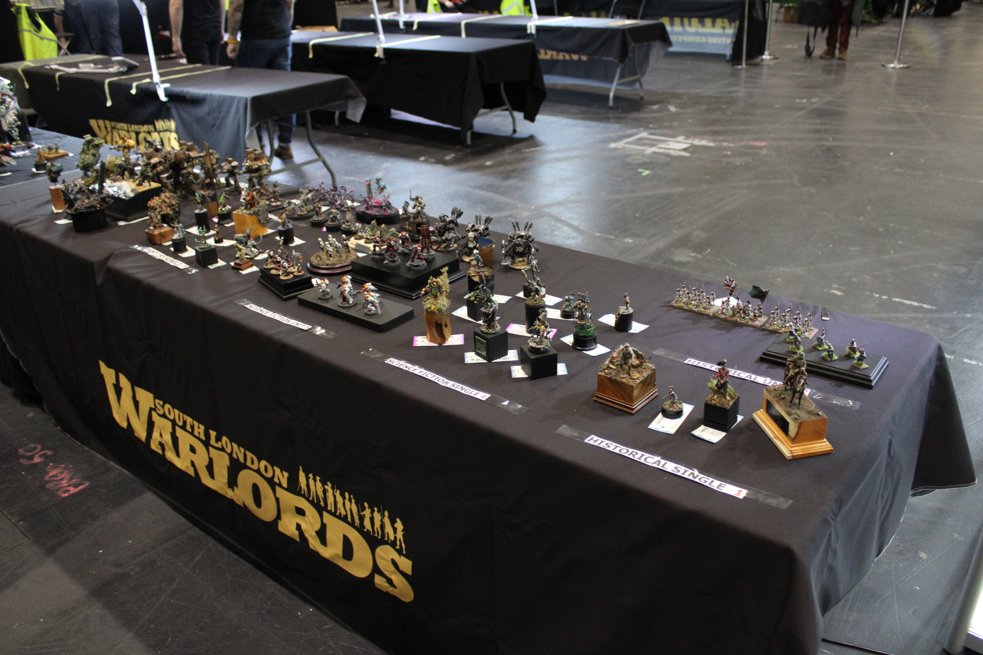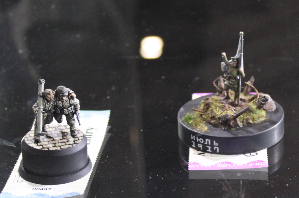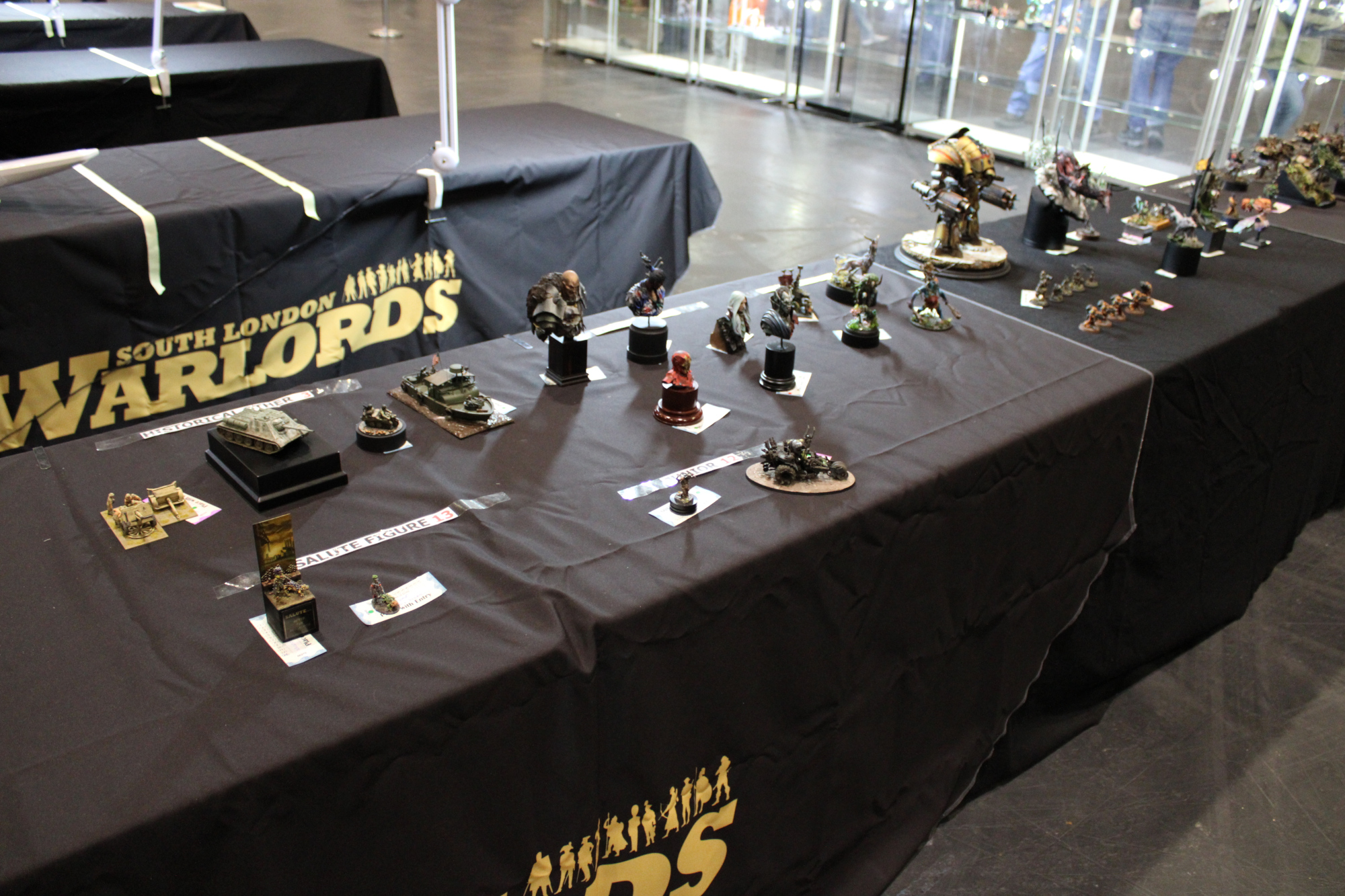 While Salute is generally known for the poor quality of lighting, I think this year it was somehow worse than normal. As usual, the lights were behind the models, presumably so the judges can see the backs of the models better without needing some fancy bit of kit like a torch. This, of course, means that we, the attendees and entrants, can barely see the figures in the cabinets. One cabinet – with the miscellaneous and large scale entries – didn’t even have any lights working. I didn’t think it was possible, but this actually made it worse.